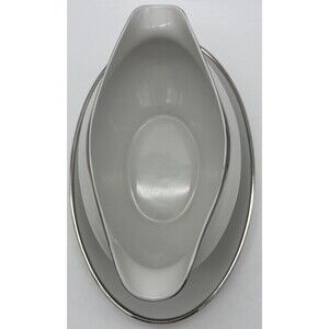 This gravy/sauce boat is a beautiful piece of Harmony House fine bone china made in Japan. The oval shaped gravy/sauce boat is in the classic white color with a glossy finish that complements the mid-century modern style. The model number for this piece of dinnerware is Harmony 3545. It is an original vintage piece and will be a perfect addition to any serving set or collection.