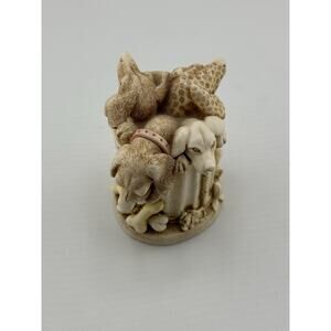 The Harmony Kingdom "Nic Nak Paddywak" Dogs in Can 1996 Rare Boot Inside is a small contemporary figurine featuring hound dogs in a matte beige finish. This 3D effect sculpture, handmade with resin and marble materials, is signed by the brand and manufactured in the United Kingdom. With a unique animal print pattern and a retired status, this collectible piece is perfect for any room and appeals to teens and adults alike. Weighing 3.6 ounces and measuring 2 inches in length, 2.5 inches in height, and 2 inches in width, this original 1996 figurine is a charming addition to any collection of decorative collectibles. It is in excellent condition with no damage.