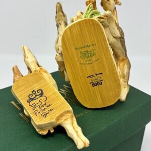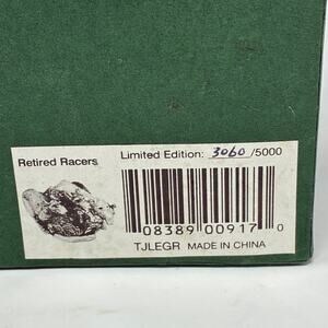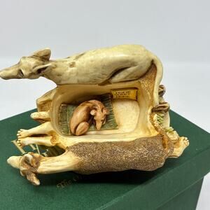 This Harmony Kingdom box figurine named "Retired Racers" was carved by David Lawrence in 1999. A manifestation of the art of selective breeding, the greyhound is a sleek and elegant beast. Man, always eager to bet on something, created the racing dog for his own amusement. On the exterior of the box figurine hides a rabbit, often used as an unfortunate lure in the training of racing greyhounds, and a few small mice are flying out from under the feet of the speedy hounds. The CL refers both to Catherine Lawrence, the sculptor's baby daughter, and Catherine Leicester, an avid HK collector and dedicated greyhound rescue worker. On the interior relaxes a retired racer receiving a well-deserved rest. Once he competed in the tough and dangerous world of the dog track. Now he feels safe in his newfound home and curls himself into a sleepy ball of fur.