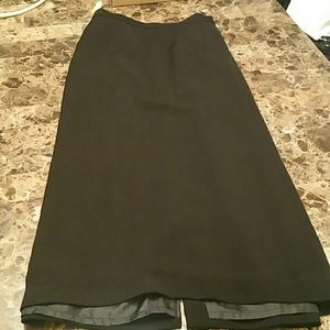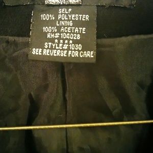 Black 3 piece suit. All very simple. No designs. Jacket with one hook and eye closure. Sheath tank and skirt that hits mid calf. Skirt with elastic on both sides for added comfort and stretch. Fully lined jacket and skirt.