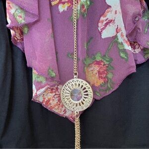 This plus-size top features a dual-layered design with an asymmetrical floral draped mesh overlay. The slimming effect is enhanced by the contrast black tank underneath. A stylish and comfortable choice for any occasion.