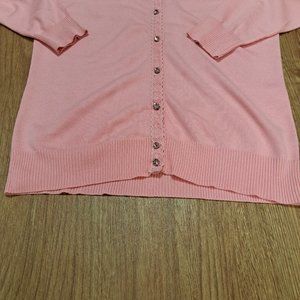Harold Pink Silk Blend Misses Sweater - Size Medium NWT. All pink crystal buttons intact. Pink lace trim. Ribbed hem and cuffs. 55% Silk/25% Cotton/17% Nylon/3% Spandex. Measurements - Shoulder to shoulder laid flat- 15", Bust- 36", Sleeve Length - 19", Sweater Length from Shoulder to Hem - 24". Perfect, classic button down light weight sweater.