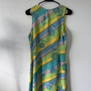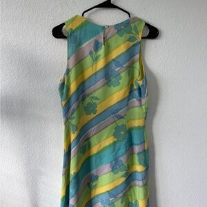 Elegant silk dress by Harold's. Features a blend of yellow and green hues.