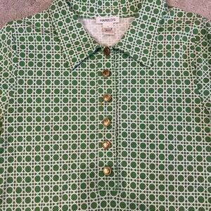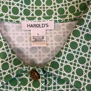 Keywords: Harold's, Polo Shirt, Wicker Print, Green Polo, Short Sleeve Top, Women's Polo, Size L, Casual Top, Fleur de Lis Buttons, Printed Polo, Vintage Style, Preppy, Retro