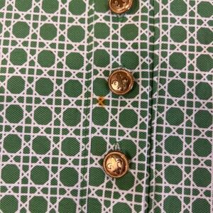 Eye-catching polo shirt featuring a vibrant green and white wicker print. This short-sleeve top has a classic polo collar and a five-button placket adorned with gold-tone buttons, each detailed with a fleur-de-lis design. The shirt is made from a comfortable knit fabric, offering a slight stretch for a flattering fit. Note a small stain is present on the front of the shirt.