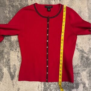 Stylish red cardigan featuring black trim and button details. Perfect for adding a pop of color to any outfit.