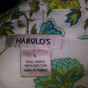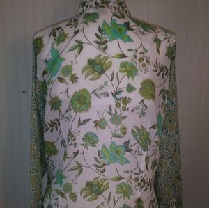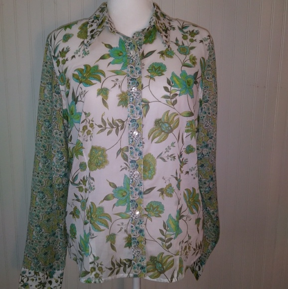 Vibrant blue and green long sleeve, floral print blouse. Button up front. Wil look great with denim jeans. Shell fabric and 100% cotton. No flaws.