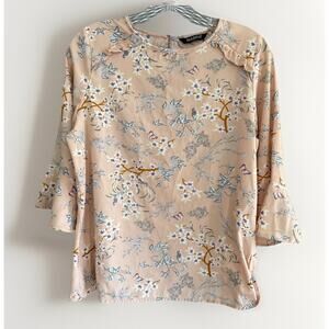 Lightweight and versatile blouse with a delicate floral and butterfly print. The peachy-pink tones and 3/4 bell sleeves make it perfect for layering through spring, summer, and into fall — pair it with a cardigan, blazer, or denim jacket for a chic seasonal look.