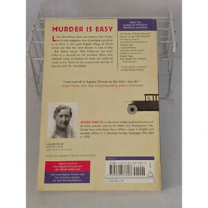Pre-owned paperback book, "Murder is Easy" by Agatha Christie. Published by Harper. The book measures approximately 7 x 4 x 1 inches. It features a purple cover with red and yellow lettering. The paper shows some age and handling, with minor creasing and discoloration. The text block is intact, though some pages exhibit slight yellowing. The cover shows minor wear consistent with previous use. No significant tears or markings are visible. The spine is slightly creased. Overall, the book is in acceptable condition for its age.