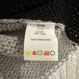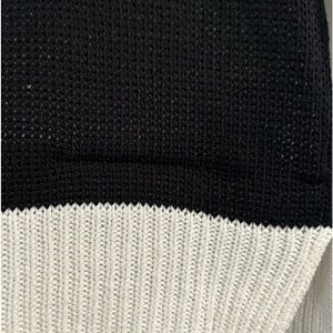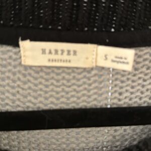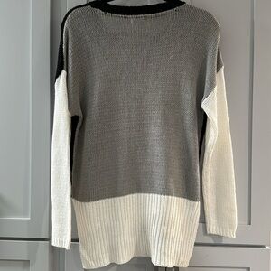 Lightweight sweater from Harper. Black front with gray back and white sleeves and trim. Back is longer (28”) than front (24”). There is a pull at the bottom of the front that looks like part of the design (see last photo). Measures 20” pit to pit.