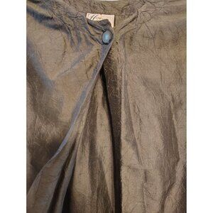 Elegant Harper Greer tunic blouse jacket in crinkle black silk. Perfect for artful layering and unique style. Medium oversized fit offers a relaxed artsy look. It has a single large button at the top for a fashion-forward look. This amazing piece measures 37" in length from the top seam of the shoulder to the bottom hem and 32" from pit to pit. Please see all photographs as they are part of the description. Shipped with USPS Ground Mail.