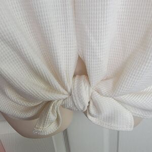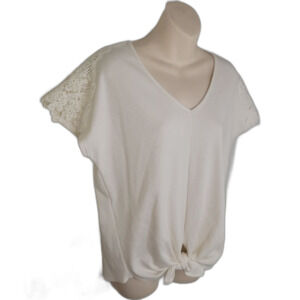 New with tags. Francesca's ivory waffle knit lace trim short sleeve top. Size small with a knot hem.