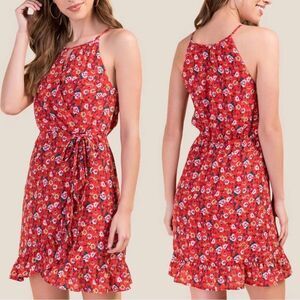 Harper Hertage red floral crepe split neckline wrap bodice ruffle skirt halter midi. Elastic waist. Left waist faux tie belt. Lined. 100% polyester. medium. New, no tags. Nonsmoking home.