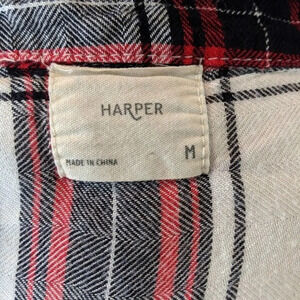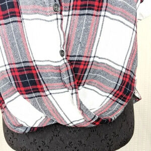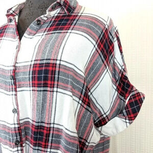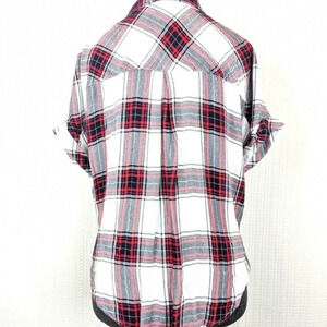 White and red plaid Harper top. Drape surplice twist front. Button down. Rolled cuff sleeve.