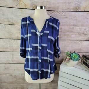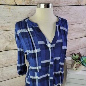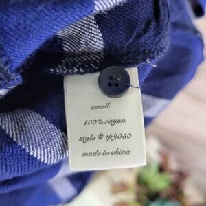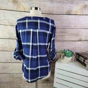 Harper Women's Plaid Flannel Collarless Henley Button-up Shirt Blue Small