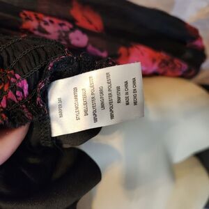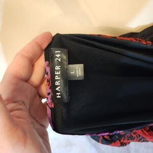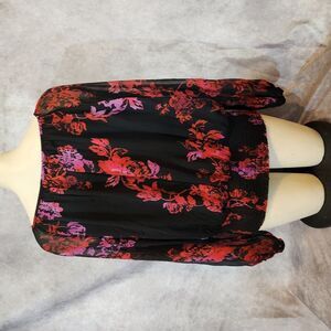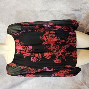 This Harper 241 blouse showcases a relaxed fit with a striking floral pattern in red and pink hues. The long sleeves are crafted from a sheer material, adding an elegant touch to the flowing silhouette. Perfect for adding a pop of color to any ensemble. Size Large, only worn once
