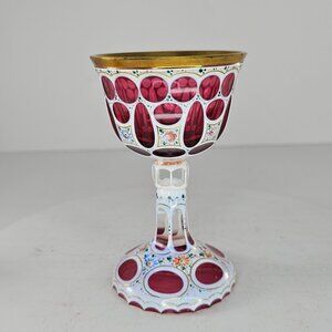 Harrach Bohemian Double Overlay Enamel Floral White Cranberry Wine Glass *FLAW