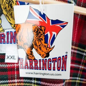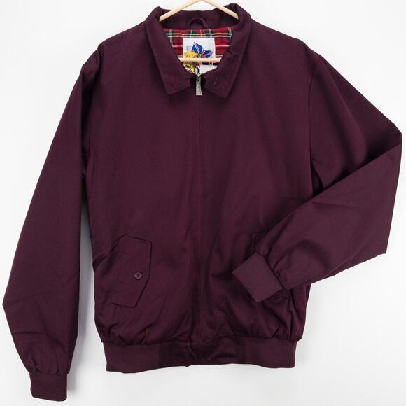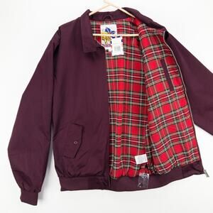 Harrington lined windbreaker jacket in Burgundy, tagged Men’s 2XL but fits closer to a Large—check measurements. Flannel-lined interior with classic red tartan offers midweight warmth and structure. Zip front, point collar, and button-flap pockets for a classic silhouette.