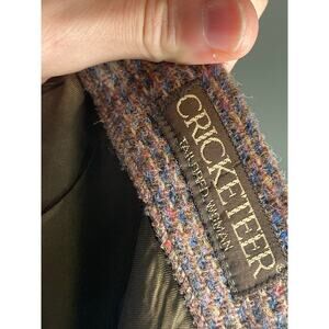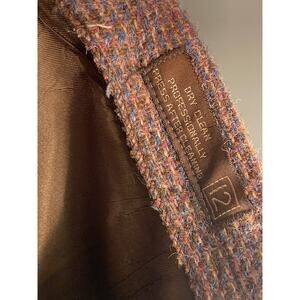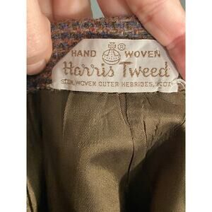 This vintage Harris Tweed pencil skirt showcases a classic blend of lavender, brown and blue tones, exuding timeless elegance. Crafted from authentic Harris Tweed wool, renowned for its quality and durability, the skirt features a tailored silhouette that flatters the figure. The size is marked as 12, but please note that vintage sizing often runs smaller; this piece is estimated to fit like a modern medium. The skirt is fully lined, has a front zipper, tab and button at front and pockets on side. Absolutely gorgeous - check the detail!