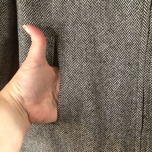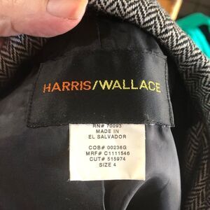 This Harris Wallace city college tweed jacket is crafted from a gray wool blend tweed fabric, making it a stylish and versatile choice for workwear or business attire. The jacket features a full zip closure, long sleeves, and a short length, with a size 4 fit for a tailored look. It is lined with polyester for added comfort, has pockets for practicality, and is designed as a basic jacket with a designer theme, perfect for the fall and spring seasons. The lightweight construction and classic design make it a sophisticated addition to any wardrobe.