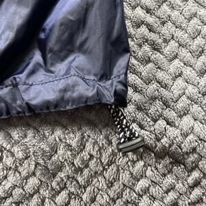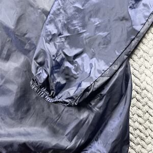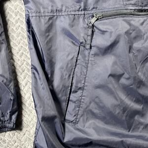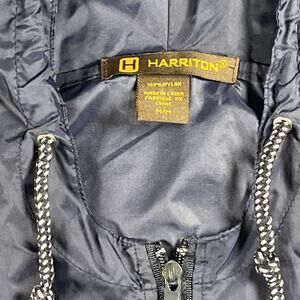 The Harriton Anorak Jacket is a vintage blue windbreaker rain jacket rain coat designed for men in a medium size. Made of lightweight nylon fabric, this mid-length jacket features a 1/4 zip closure with a drawstring for a secure fit. Perfect for outdoor activities or casual wear, the jacket is machine washable and suitable for all seasons. With a classic and nautical theme, this Harriton jacket is a versatile and stylish addition to any wardrobe.
