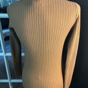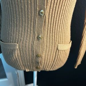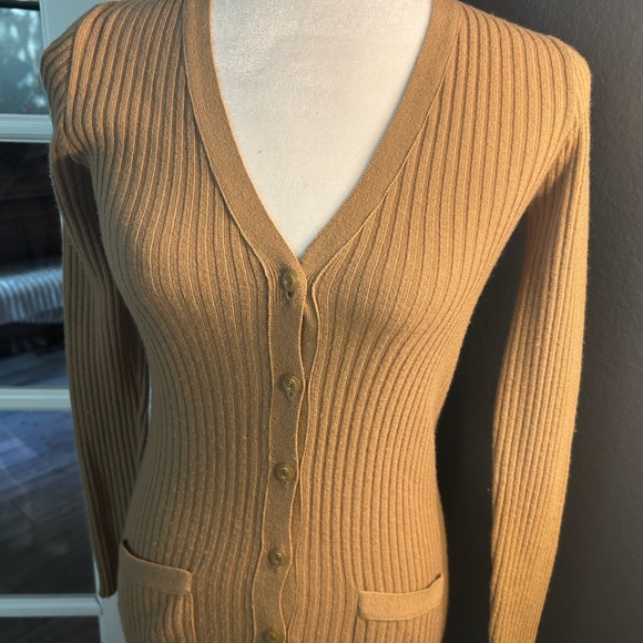 Slim ribbed cardigan with a deep V-neck. Button-front closure and two small front pockets. Streamlined silhouette for layering. Classic camel tone for versatile styling. Missing size tag.