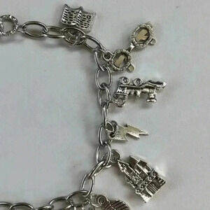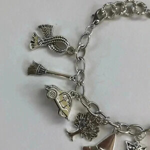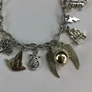Makes a great gift for a Harry Potter fan! 12 charms including the scarf, broom, VW bug car, tree, Wizard hat, Owl, golden snitch, castle, lightning bolt, train, glasses, and book. Approximately 8 inches total length and adjustable. Made of zinc alloy. Bundle and save. I ship fast!