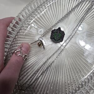 Snitch necklace, Slytherin pin, and handmade Harry Potter ring made with silver wire and gently worn.