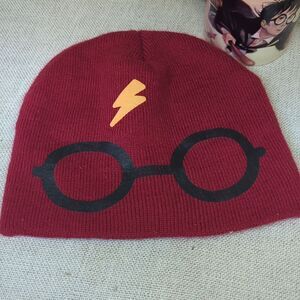 Harry Potter themed beanie and book set. Includes a red beanie with glasses and lightning bolt design, a Harry Potter book, and a collectible car.Trabant Harry Potter.