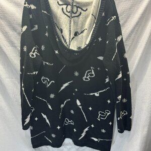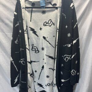 Embrace your inner witch or wizard with this enchanting Harry Potter hooded cardigan from the exclusive Hot Topic Collection. Perfect for fans of the Wizarding World, this black and white knit features iconic symbols like lightning bolts, Harry's glasses, wands, and stars, making it a magical addition to any wardrobe. The unique design hints at a reversible style with contrasting interior patterns, offering versatile wear. Crafted for comfort, this open-front cardigan is ideal for layering and adds a touch of fantasy to any outfit. In good condition, it's ready for its next adventure. Whether you're channeling dark academia vibes or leaning into a whimsical goth aesthetic, this cardigan is a must-have statement piece.