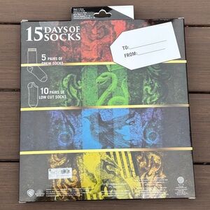 You are purchasing a new (sealed) Harry Potter-Themed 15 Days of Socks Christmas Holiday Advent Gift Set (Women's Shoe Sizes 4-10). Socks are mixed designs with 5 Pairs of Crew Socks and 10 Pairs of Low Cut Socks. Comes from a pet-free, smoke-free environment. ***I ship same, next business day (depending on time of purchase).***