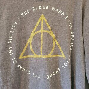 Details: Gray. 50% Cotton 50% Polyester. Long Sleeve T-Shirt. Gold sparkle deathly hallows symbol.