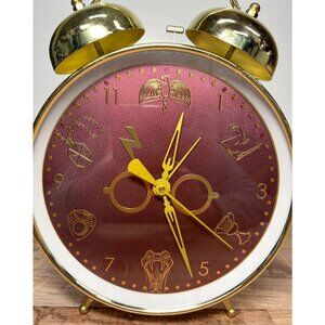 This Harry Potter-themed alarm clock features iconic Hogwarts symbols on a red face, enclosed in a gold-finished metal frame. Its twin-bell design ensures a timeless aesthetic, while the intricate details cater to fans of the Wizarding World. Suitable for collectors or practical use, its design merges functionality with fandom. 12'' Tall, 9.25'' Wide, 3'' Deep Some marks on top of the bells, See pic