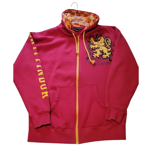 Unisex Large, Harry Potty, Gryffindor burgundy jacked with yellow embroidery on the chest and "Gryffindor" going down the sleeve. Zipper works great. It is still very soft on the inside. No other stains. No rips or holes.