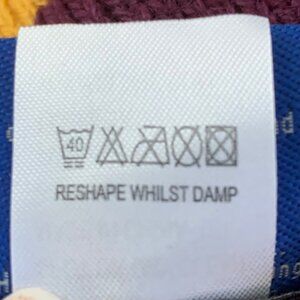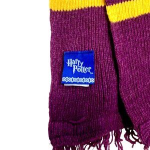 This is a 100% lambs wool scarf inspired by Harry Potter's Gryffindor house. Featuring a purple and yellow stripe pattern, the scarf measures 74 x 11 inches, perfect for cozying up in during colder weather.