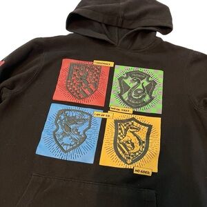 • Design: Hogwarts house shields, bold sleeve print, front kangaroo pocket, fleece-lined