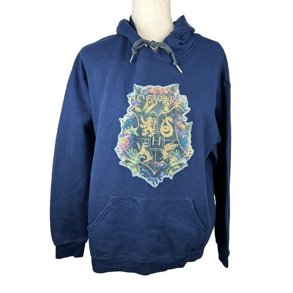 Navy blue hoodie sweatshirt with glittery Hogwarts crest surrounded by flowers. Smoke free home.