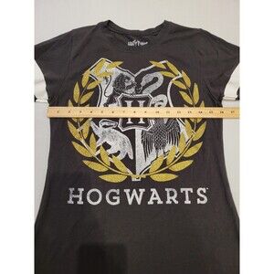 This is a Harry Potter Hogwarts tee for juniors. The shirt features a glittery house crest in gold on a gray background. It has a classic fit with short sleeves and a crew neck. The material is a blend of polyester and cotton, making it machine washable. The tee is a Juniors size and showcases the iconic Harry Potter theme, perfect for any Potterhead.