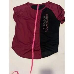 Harry Potter Hogwarts graphic athletic tee with tie back, measurements in pictures as shown. The color is burgandy