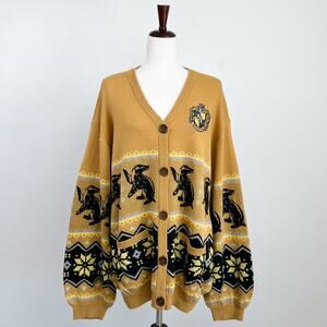 Size Medium (Unisex men's and women's) Harry Potter Knit Cardigan. Hufflepuff House badger design. Embroidered House Crest on the chest. Button-up v-neck with wooden buttons. Pockets! Great condition!