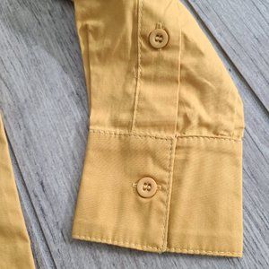 Authentic Wizarding World of Harry Potter Hufflepuff button-up shirt from Universal Studios. Features a golden yellow color with embroidered Hufflepuff crest patch on the chest pocket, plaid contrast trim along the button placket and collar, and long sleeves. A must-have for fans and collectors of Hogwarts house apparel. Originally retailed for $70.