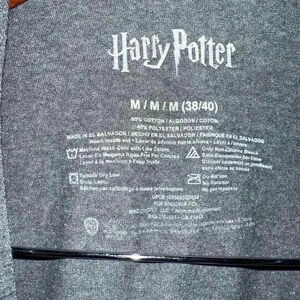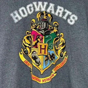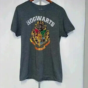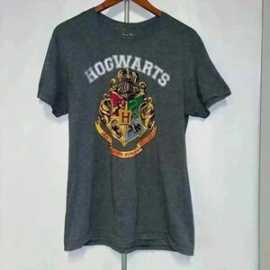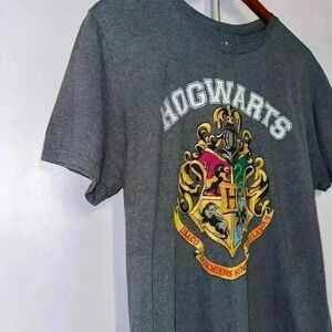 This is a pre-owned Harry Potter Hogwarts Crest T-shirt. It is a men's size medium and is made of 60% cotton and 40% polyester. The shirt is a dark gray color and features a large, colorful Hogwarts crest on the front. The crest is surrounded by the word "HOGWARTS" in white letters. The shirt is in good condition with no visible tears or stains. The tag indicates that it is machine washable and tumble dry low.