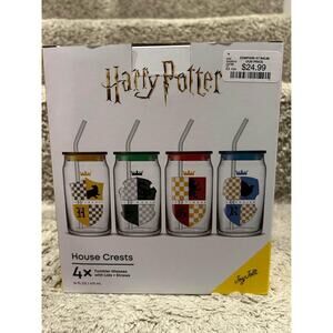 Set of four Harry Potter pop-can style glasses with lids and straws. Each glass features one of the House Crests from the Harry Potter books and movies: Gryffindor, Ravenclaw, Hufflepuff & Slytherin.