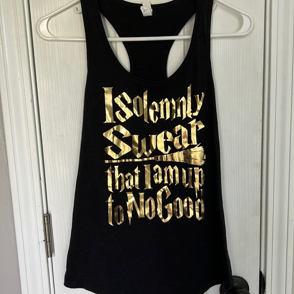 Black racerback tank with gold writing “I solemnly swear that I am up to no good.”