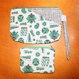 Wristlet is single pocket. Wallet has a zipper to access coin purse and ID holder.