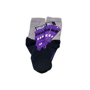 🧦 Knight Bus socks in purple and gray with the iconic triple-decker design.