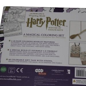 Harry Potter Winter At Hogwarts Coloring Set. The set includes: a 48 page coloring book, a build it yourself 3D firebolt broom, 48 colorable gift tags with string.