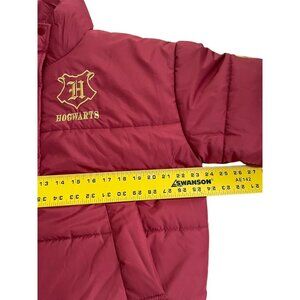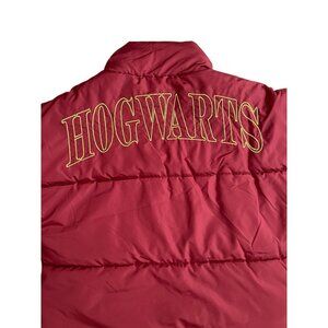 Explore the magical realm of fashion with the Harry Potter Wizarding World Hogwarts Puffer Jacket. Designed for the modern witch or wizard, this red jacket in size XS is a stylish homage to the beloved series. It features a sleek solid pattern with the iconic Hogwarts logo embroidered on the chest, full zip closure with a snap overlay, and convenient pockets for your spellbooks and potions.