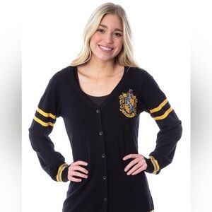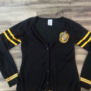 HUFFLEPUFF HOUSE CREST CARDIGAN - This Harry Potter Hufflepuff open-front cardigan has the house crest stitched on the chest. A varsity-style black sweater with yellow stripes at the sleeves and yellow and grey at the waist. Six buttons ( Missing one ) are located on the front of the cardigan for closure pre owed excellent condition no flaws smoke free home size XL