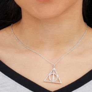 Stylishly enter the Harry Potter universe wearing a Deathly Hallows pendant necklace. Triangular pendant features the Deathly Hallows symbol